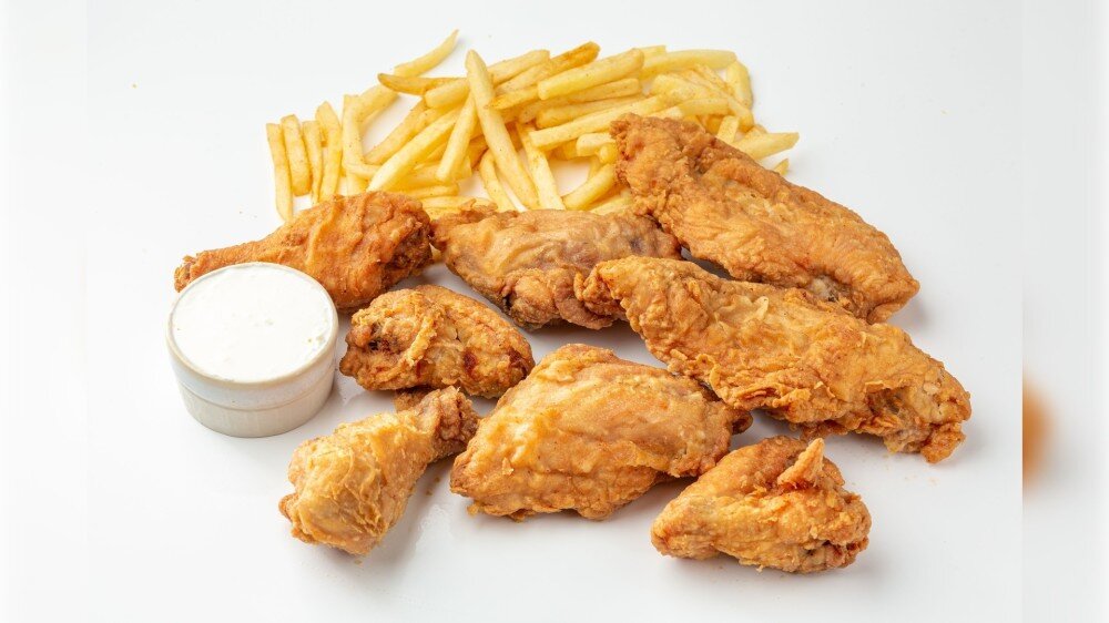 Максимальная порция хрустящей курицы — 8 кусочков, картофель фри, и чесночный соус. Отличный выбор для большой компании!