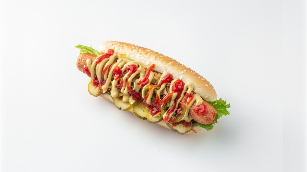 Хот-дог, от которого слюнки текут! Сырная сосиска, хрустящий айсберг, маринованные огурчики, жареный лук и огонь халапеньо. Всё в мягкой булочке с горчицей и кетчупом — взрыв вкуса в каждом укусе!