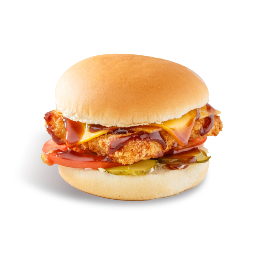 Неповторимый вкус соуса BBQ в сочетании с сочной куриной котлетой,маринованными огурцами свежими помидорами и салатом. .
