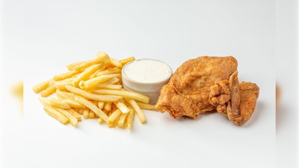 Нежные кусочки сочной курицы в фирменной панировке с картофелем фри и чесночным соусом. Идеально для быстрого перекуса!