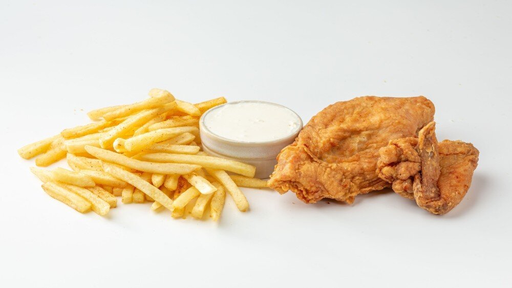 Нежные кусочки сочной курицы в фирменной панировке с картофелем фри и чесночным соусом. Идеально для быстрого перекуса!