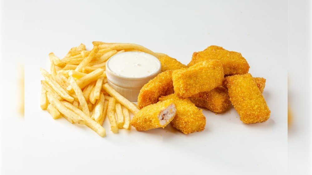 7 кусочков сочных наггетсов с золотистой корочкой, картофель фри и чесночный соус — отличный выбор для двоих.