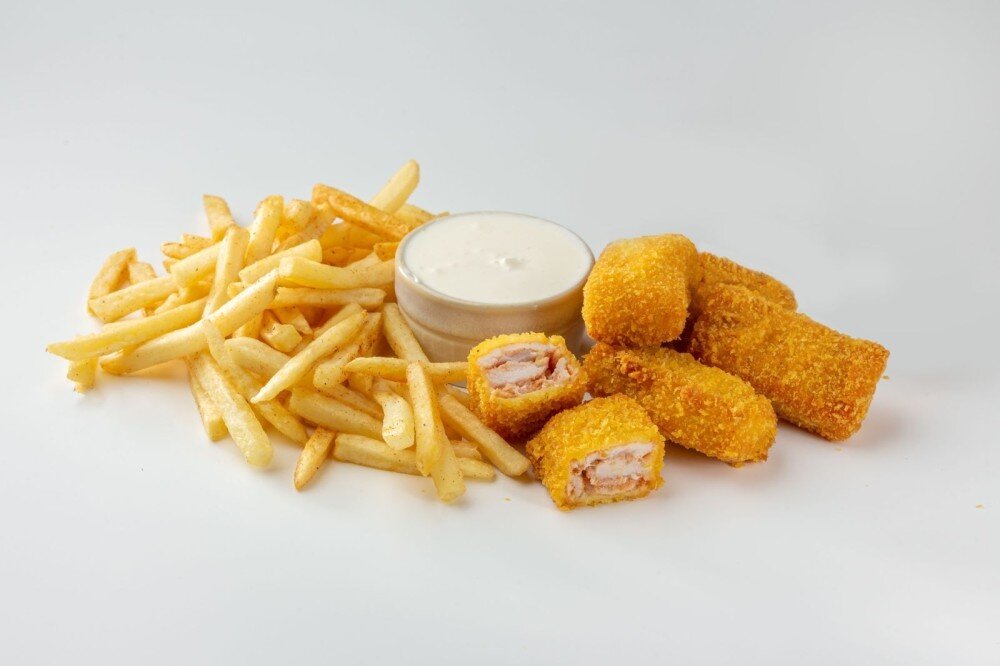 Увеличенная порция для любителей наггетсов: 5 нежных кусочков курицы с картофелем фри и чесночным соусом.